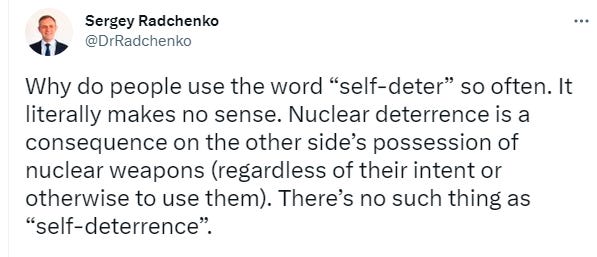 About one month ago I jumped on the Substack bandwagon wanting my own space to write and rant about all things deterrence. Until today one thing or another popped up and the Substack remained low on the priority list. However, scrolling through my Twitter feed yesterday afternoon I came across a tweet from one of my favorite academics, Sergey Radchenko, in which he has some very nasty things to say about self-deterrence:
